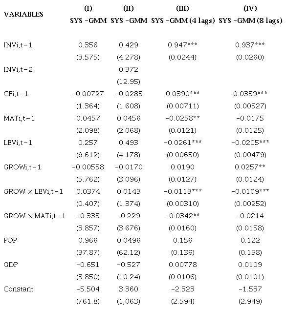 In the dynamic-panel model with variables in natural logarithms presented in equation (1), by construction, the lagged dependent variable (INVi, t-1) is correlated with the unobserved individual effect, so that it is possible to estimate the model based on the equations of moments constructed based on higher lags of INVi and the first differences of the residuals as proposed by Arellano and Bond (1991).