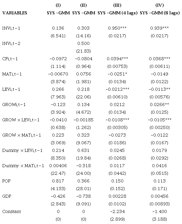 The GROW × LEVi, t-1 and GROW × MATi, t-1 variables composed by the interaction with growth opportunities were also significant, with only one exception in the IV estimate, in which GROW × MATi, t-1 was not significant. The sign of both interactions is consistent with the identified relationship between investment and leverage (negative) and investment and maturity (negative). However, since the GROWi, t-1 variable was only significant in the 8-period lag model, the relationship between growth and investment opportunities does not provide the empirical support needed to prove the impact of this interaction.