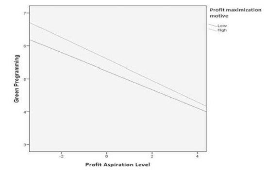We now investigate if profit aspiration levels make heuristics based solely on the profit maximization motive inadequate. We propose that the profit maximization motive does moderate (i.e. behaviorally and inappropriately bias) the relationship between profit aspiration level and green programing. When the profit maximization motive is strong, then firms may be more inclined to lower their priorities on green programing as their profit aspiration level increases - since, based on their aspirational signals, they are likely to believe that a lower level of green programing is needed to achieve their high profit aspirations. Firms are likely to perceive less need to reduce green programing with increasing profit aspirations when their profit maximization motive is weak. Thus, the positive effect of the profit maximization motive on green programing will decrease as the firm’s profit aspiration level rises. Therefore, we hypothesize that: