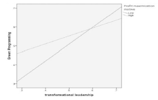 H5 (The social benefit of the proficient management perspective): The positive relationship between firms’ transformational leadership and their green programing is stronger when a firm’s profit maximization motive is weak than when it is strong.