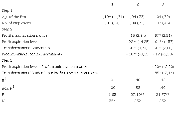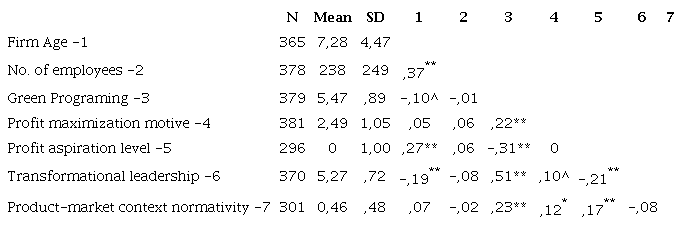 Product-market context normativity: We used Lumpkin and Dess’s (2001) measure. The participants reported a percentage of firm revenues accounted for by products/services at four lifecycle stages: introduction (I), growth (G), maturity (M), and decline (D). Product-market context normativity is a weighted average that uses the following formula: 1*I + 2*G + 3*M + 4*D. This is a single continuous stage of product lifecycle measure, where a higher score reflects the firm’s average involvement in a later (mature) stage of the product lifecycle. The sample average is 2.34, indicating a group of firms whose product portfolio is between the growth cycle and the maturity cycle, i.e. is beginning to experience product-market context normativity. A post-growth context implies that the growth of the firms is cooling down, because of escalating cost trade-offs and challenges in sustaining aspirational profit-making due to social ecosystem, regulatory, and/or market factors.