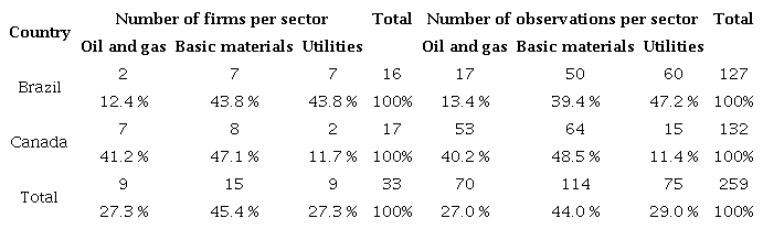 The sample of this research is formed of companies in Brazil and Canada, included in the Forbes list “Global 2000 - The World’s Largest Public Companies,” published in 2008 (using data from 2007). The selected companies were publicly traded firms listed in the B3 Brazilian stock exchange and the Toronto Stock Exchange, operating in three sectors: basic materials, oil and gas, and utilities. The sample was formed of 33 companies. The study collected the companies’ sustainability reports available in the period from 2007 to 2015, from the firms’ institutional websites and the Global Reporting Initiative (GRI) database. In total, the research included 259 observations, 127 of companies in Brazil and 132 of companies in Canada. Table 1 shows the sample composition.