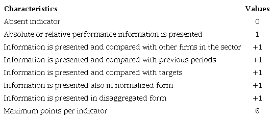 Following Fischer and Sawczyn (2013), each category was scored from 0 to 6, considering: 0 when no information is disclosed; 1 when performance information is presented in absolute or relative terms. An additional point is added when, in addition to the information in absolute or relative terms, there is information: in comparison with similar/rival firms in the sector; in comparison with previous periods; in comparison with targets; in a normalized way, or in disaggregated form. The SED variable was considered in percentage, so a firm with indicators with a score of 6 will present, for analysis, 100% disclosure. The characteristics evaluated for each indicator are presented in Table 2.