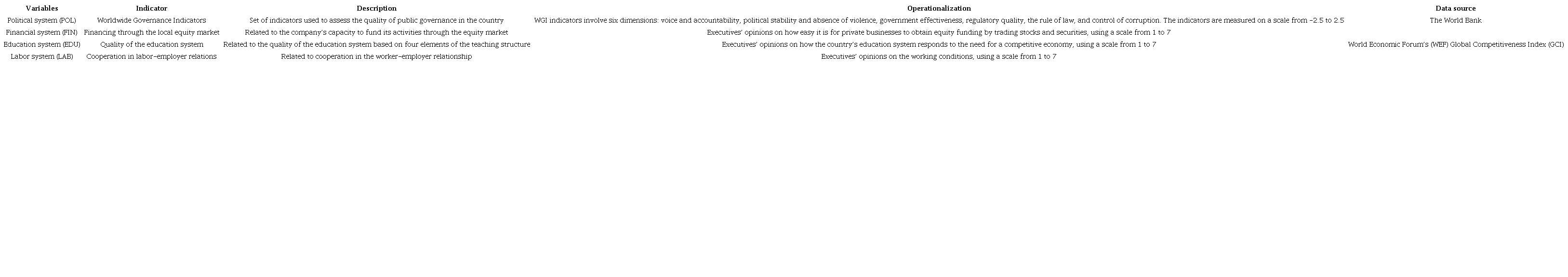 The independent variables are related to the institutional structures that make up the two countries’ national business systems. An indicator was chosen as a proxy to represent each pillar of the system. The indicators were selected from the databases of two international bodies: The World Bank and the World Economic Forum. Table 3 presents a synthesis of the independent variables related to the hypotheses, research description, and the data source. It is observed that the selected indicators have different scales. Therefore, for a better comparison between them, the indicators were standardized on the same scale, with values in the range of 0 for the lowest value and 1 for the highest value observed.