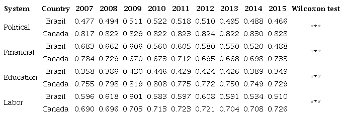 The results allow the analysis of how the systems behave over the years in both countries. In Brazil, the lowest values for the four systems are observed in 2015. In Canada, the lowest values are distributed in different years, with the lowest values for the political and labor systems observed in the first years analyzed (2007 and 2008, respectively) and those for the financial and education systems occurring at the end of the period (2013 and 2015, respectively). In addition, the percentage change between the highest and lowest value observed in each of the two countries shows a more homogeneous behavior for Canada, where the variations range between 1.6% (political system) and 14.8% (financial system). In Brazil, these variations are between 10.7% (political system) and 28.6% (financial system).