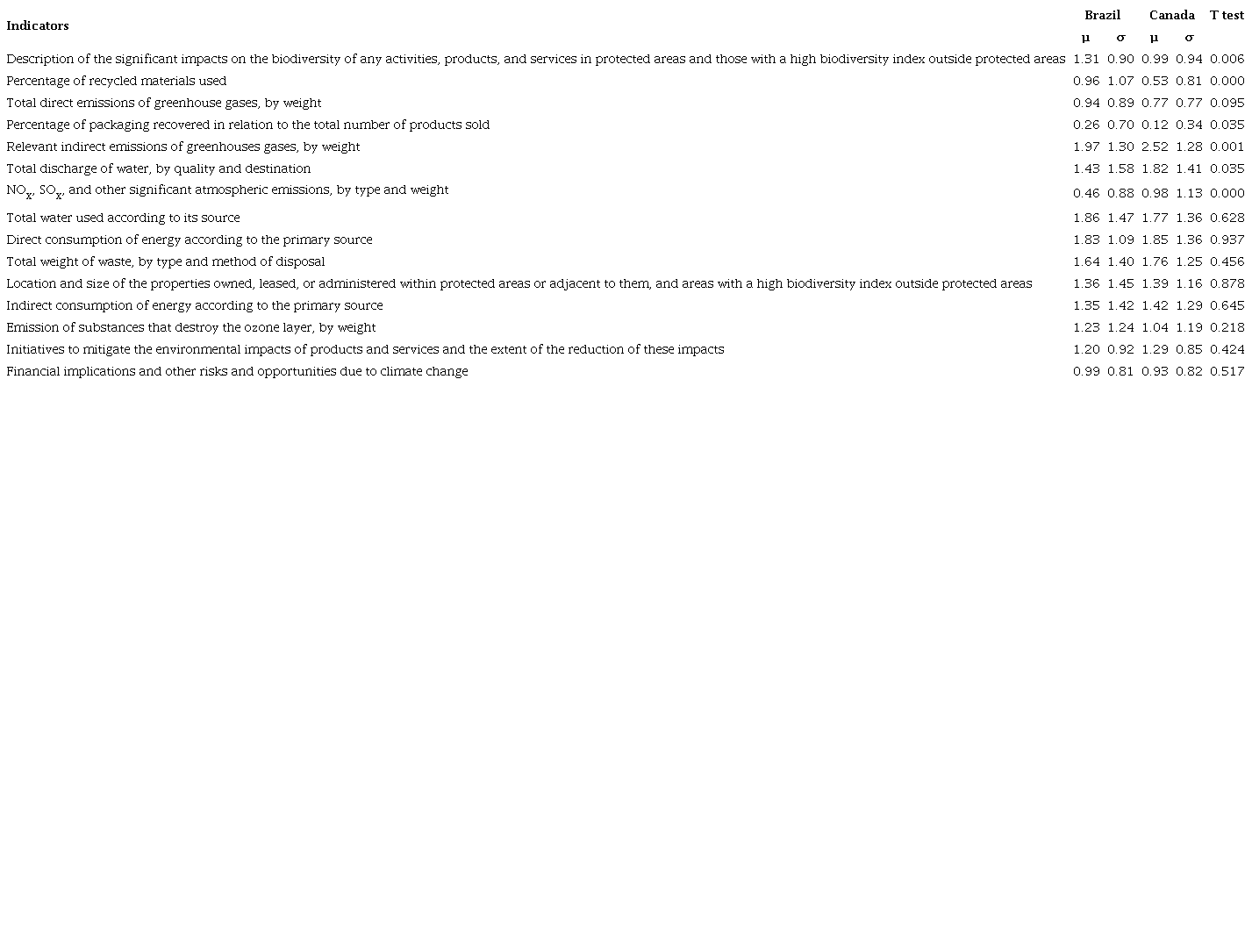 The firms in Canada placed greater emphasis on the environmental aspects related to emissions that cause acid rain and indirect emissions of greenhouse gases. Environmental aspects related to production costs, such as consumption of materials, water, and energy; generation of waste; financial implications related to climate change; and the location and area of land with a high biodiversity index, do not present significant differences between the firms of the two countries.