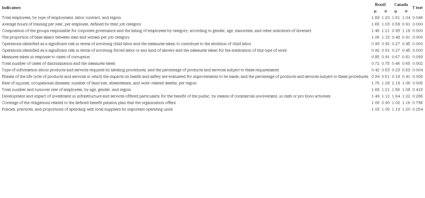 As for the firms in Canada, the disclosures on the rate of injuries, occupational diseases, lost days, absenteeism, and work-related deaths stand out, which present a higher value and are more significant in relation to the firms in Brazil. Practices regarding production costs, such as turnover rate, impacts on infrastructure investments, benefit plans, and cost policies with suppliers do not present significant differences between the firms in the two countries.