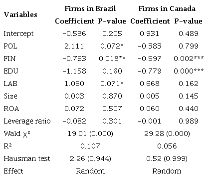 As observed in Table 7, the random effects model for the firms in Brazil has an R² of 0.107 and a p-value for the F-test with a significance level of less than 0.01. It was identified that the political and labor systems have a positive and significant effect at the 0.10 level on social and environmental disclosure, and the financial system has a negative and significant effect at the 0.05 level. For the firms in Canada, the model has an R² of 0.056 and an F-test with statistical significance lower than 0.01. The same negative effect, significant at the 0.01 level, is observed in the social and environmental disclosure for the financial system. It is also observed that the education system has a negative and significant effect. For both countries, the control variables do not exert a significant effect on SED.