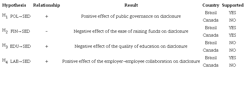 Hypothesis H3 was rejected for companies in Brazil and Canada. In the case of Canada, the education system is negatively related to social and environmental disclosure, contrary to the hypothesis’ proposition. Finally, hypothesis H4 indicates a positive effect of the employer and employee collaboration on disclosure, but the results only supported this assumption for the companies in Brazil.
