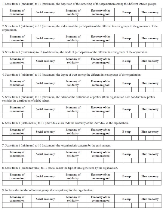 All the questions were answered with scores ranging between 1 and 10. Questions 1, 2, 4, 5, and 7 were given a score of 1 when the organization’s dispersion of ownership, extent of profit distribution, degree of trust among stakeholders, and environmental concern were lowest and 10 when they were highest. Questions 3, 6, and 8 were given a score of 1 when there was a contractual form of participation, the individual was merely instrumental, and the value generated was primarily economic; and 10 when the organization was collaborative, the individual was an end, and the value generated was primarily social, respectively.