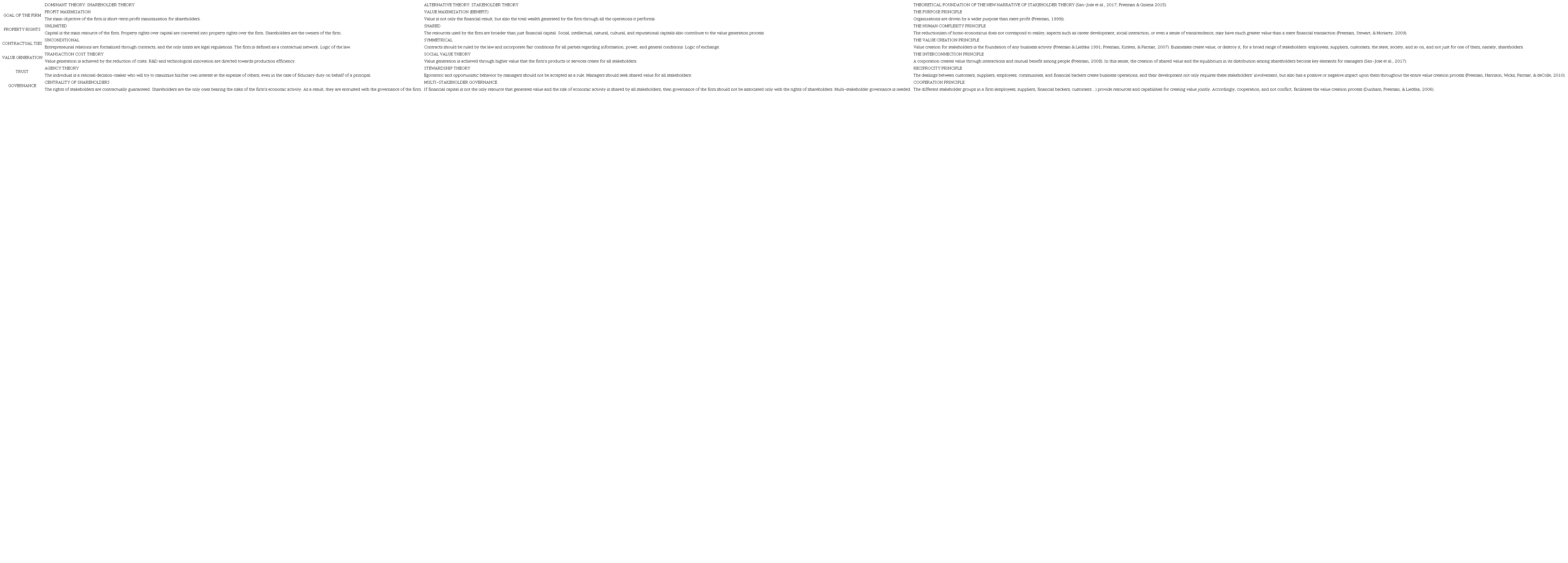 A theory of the firm is understood to develop the conceptual framework that states what a firm is and what role it should have in society and in the economy. This theoretical development serves as a basis for the legal and cultural systems surrounding the firm. Currently, the dominant theories of the firm focus almost exclusively on the value generated for shareholders (Coase, 1937) and are based on four pillars: property rights theory (Demsetz, 1967), transaction cost theory (Coase, 1960), contract theory (Barnett, 1986), and agency theory (Jensen & Meckling, 1976) (see first column in table 1).