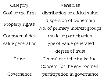 The first variable analyzed through the questionnaire was the dispersion of the organization’s ownership among the different stakeholders. The second variable was the level of participation of these stakeholders in the company’s governance. The third point studied was how these stakeholders participate in the firm, whether contractually or collaboratively. Fourth, the questionnaire asked about the degree of trust among the different stakeholders. The fifth variable was the extent of profit distribution; in those cases where profits are not distributed, the participants determined how the different models distribute the added value. Point 6 studied the centrality of the individual in the organization, i.e. whether the individual is considered as an instrument or an end. Seventh, we asked about the organization’s environmental actions. The eighth variable was the type of value generated by the firm (economic or social) and, finally, the last variable was the number of primary interest groups in the organization (small or large number). Appendix A shows the questionnaire answered by the panel of experts.