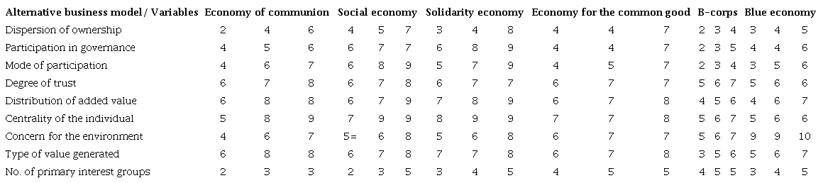 In section 2, we explained trust in the firm comparing agency and stewardship theories. The variables ‘degree of trust’ and ‘centrality of the individual’ (instrumental vs individual as an end) show high scores in the first four business models, while concern for the environment scores the highest value for the blue economy (9). Finally, regarding governance, a stakeholder approach should promote multi-stakeholder governance understanding that it is not only financial capital in the resources that generates value. In this case, solidarity economy (8) and social economy (7) score the highest results.
