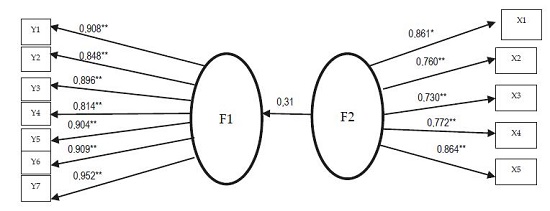 Table 10 shows the statistics that explain the goodness of fit of the proposed scales of the model. Figure 3 presents the final results of the model, including the factorial weights of the items over their respective factors, as well as the coefficients of the causal model of factor 2 over factor 1.