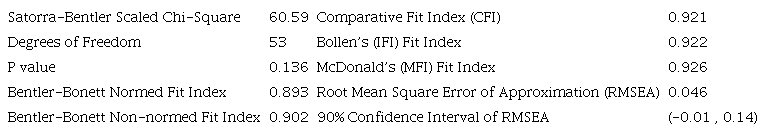c) the root mean square error of approximation (RMSEA) has to be, at least, smaller than 0.08; the indicator is better if it is lower than 0.05. Furthermore, the confidence interval of the RMSEA has to include the zero. We satisfy all these parameters (the RMSEA is 0.046, and so less than 0.08);