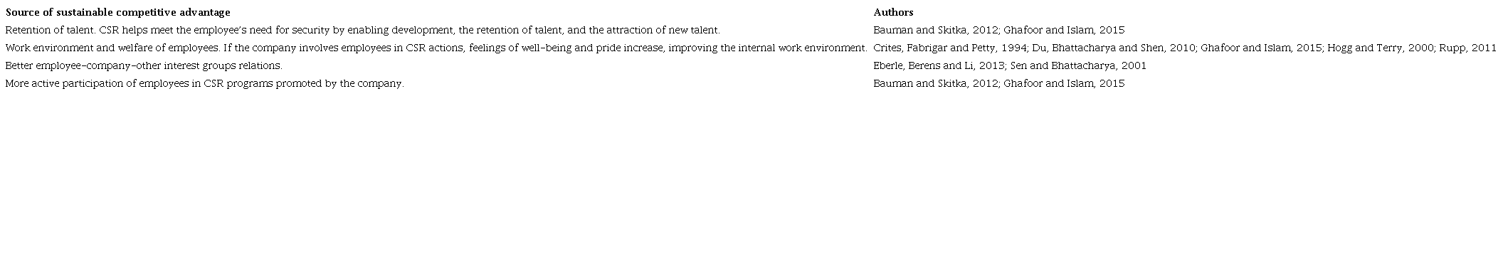 For Becker-Olsen, Cudmore, and Hill (2006), investment in CSR has become a concept that is of great interest due to its multiple human capital benefits for companies. Some of these benefits from human capital include the retention of talent, employee welfare and the best working environment, the best relationship between the company, employees, and other interest groups, and the active participation of employees in the activities of the company (Table 1).
