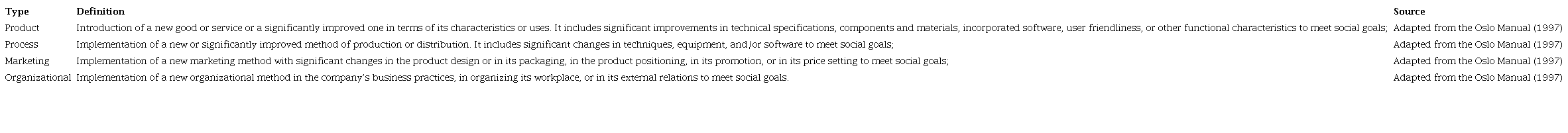 Because it is a subject that is still under construction and, consequently, does not yet present a consensus on the specific meaning, as pointed out by Pol and Ville (2009), in order to elaborate the dimensions and types of social innovation we decided to use the classification of traditional innovation offered by the Oslo Manual (1997), adapting it for a social purpose as presented in Table 1.