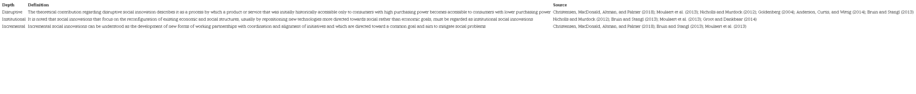 Innovations involve changes, but not all forms of changes can be qualified as innovation. Only qualitative changes that deconstruct practices and common knowledge in a particular area can be called innovations. In this sense, innovations can also be classified according to their magnitude. Social innovations occur at multiple levels based on the focus of expertise, which can be of a disruptive, incremental, and institutional nature (Nicholls & Murdock, 2012), as presented in Table 2.