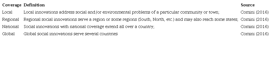 As the intention of this study is to propose a scale to classify social innovation in terms of types, depths, and coverage, we decided to use the coverage classification used by Comini (2016), which consists of observing the occurrence of social innovations from a local to a global perspective, as presented in Table 3.