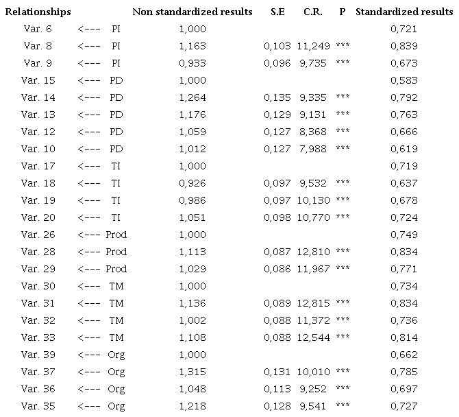 After deleting the variable, the model showed further improvement, through weaker than the previous one. The global fit measures in this round were: χ ² (302) = χ ² 822.975/df = 2.725; CFI = 0.859; TLI = 0.837; NFI = 0.797; MECVI = 3.776; RMSEA = 0.081; and pclose = 0.000. Observing the factorial loads, we still verified variables that did not reach the minimum reference value for the parameter. In the Organizational Type construct, variable 38 presented a factorial load of 0.57 and commonality of 0.32, and so it was excluded from the analysis.