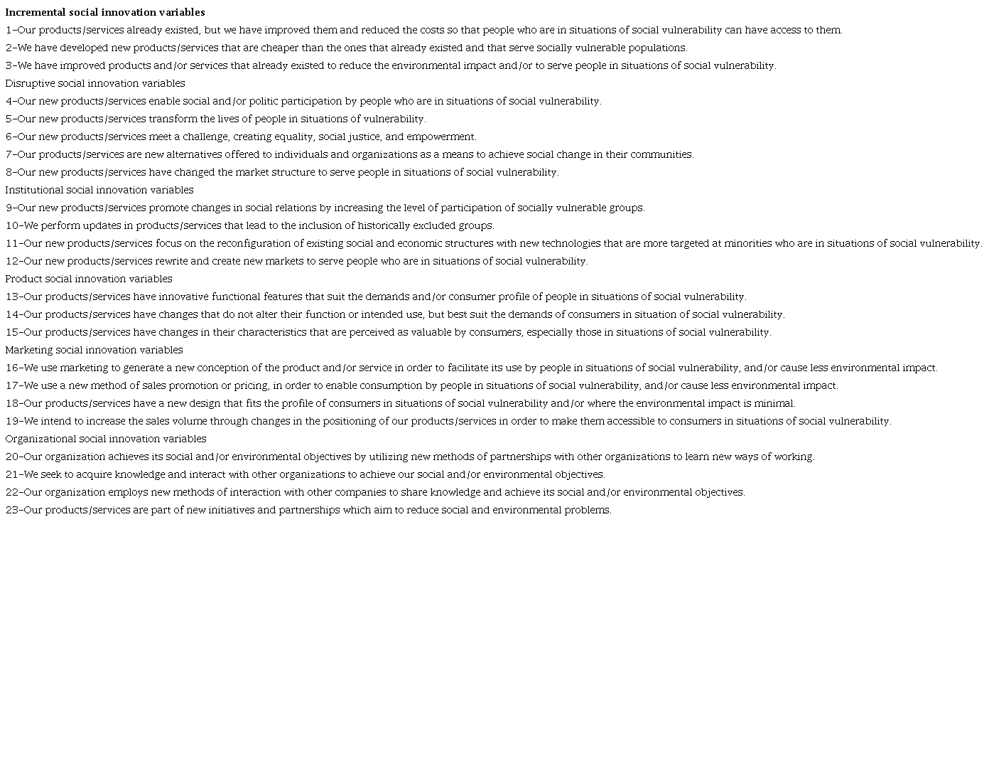 After the entire methodological process for the development of the scale and the descriptive analyses of the sample, we present the final validated scale in Table 6. We emphasize that of the 59 items initially developed, 23 remained, which, in turn, evaluate the product, marketing, and organizational types of social innovation; and the incremental, disruptive, and institutional depths. Regarding the geographic coverage, we decided not to include this in the final scale because each researcher could choose to use it or not.
