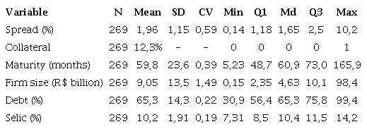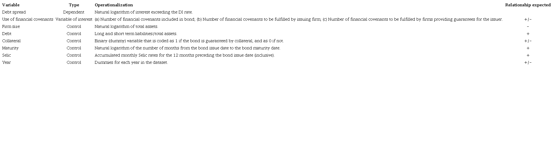 In addition to these two variables, spread and financial covenants, control variables that could have an effect on spreads were also included in the regression models. These variables were as follows: (a) characteristics of the firm (size and debt), to capture the firm’s risk, where a negative relationship is expected for size and a positive relationship for debt, since larger firms tend to be less risky for creditors (Rajan & Zingales, 1995), and firms with less debt tend to be less risky (Graham et al., 2008); (b) characteristics of the debt (collateral and maturity), since firms can issue bonds with shorter maturities to reduce creditors’ risk (Nash, Netter, & Poulsen, 2003) or offer collateral to confer additional protection. Notwithstanding, Bharath et al. (2008), Hasan et al. (2012), and Knyazeva and Knyazeva (2012) found that firms that borrow at higher rates are also required by creditors to provide more guarantees. Therefore, a negative relationship is expected for debt maturity, whereas there is no a priori expectation with relation to collateral; (c) macroeconomic characteristics (the Brazilian central bank base rate - Selic, and annual dummy variables), where a positive relationship between the Selic and spreads is expected, since variations in the Selic rate (which is a risk-free rate) are expected to have an effect in the same direction on bonds that incorporate risk.