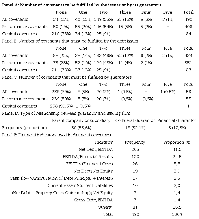 It is against this background that this paper attempts to identify the relationship between the use of financial covenants and the cost of issuing debt via corporate bonds in Brazil. The analysis contributes to filling gaps in the literature by investigating how financial covenants are priced by creditors in an institutional environment with weak protections for creditors and poor legal enforcement and also by testing whether pricing varies as a function of which firms are obliged to fulfill financial covenants, whether (a) the debt issuer or (b) firms providing guarantees for the issuer.