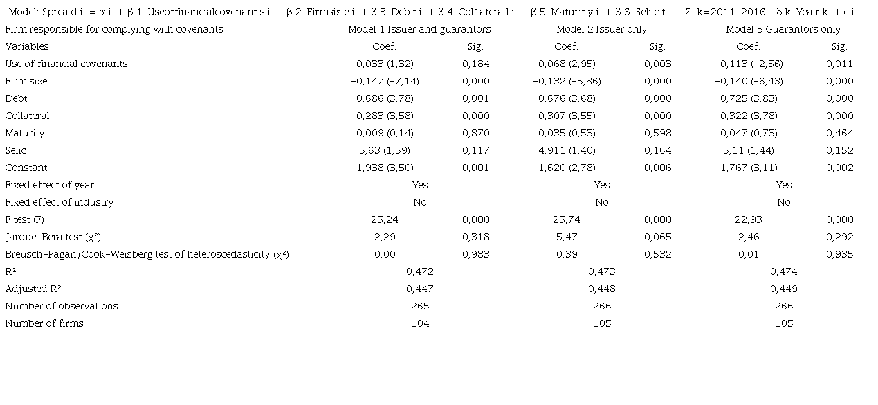 With regard to the control variables, the results were in line with the relationships expected a priori, with the exception of collateral, maturity, and Selic. This indicates that the observed effect of the use of collateral is similar to that for financial covenants that must be fulfilled by the debt issuer, i.e., it is used to confer additional protection to complement the risk premium, and is offered to enable borrowing. This finding is consistent with the argument that riskier borrowing operations are subject to both higher interest rates and more demands for additional guarantees (Bharath et al., 2008), in line with results observed by Bharath et al. (2008), Hasan et al. (2012), and Knyazeva and Knyazeva (2012). In turn, the absence of any effect of maturity on the spread could be because the variable employed to measure maturity is an ineffective proxy to represent the duration of bonds, which is the true length of time that the creditor is exposed to the lending risk. The absence of any effect of the Selic rate can be explained by the dummy variables for each year in the dataset capturing the majority of its effect on the spread. When the regressions were run again without the year dummies, the Selic rate had a positive relationship that was statistically significant with a 99% confidence level.