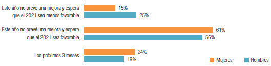 La figura 4 muestra que el 61 % de las empresarias y el 56 % de los empresarios consideraban que en el año 2020 no habría mejora y esperaban que el 2021 fuera favorable, solo el 24 % de las empresarias esperan que sus negocios mejoren los próximos 3 meses y en el caso de los varones el 19 % espera que sus actividades mejoren en los próximos 3 meses.