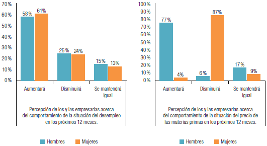 La percepción sobre el precio de las materias primas es muy diferente entre las empresarias y los empresarios ya que el 87 % de las mujeres considera que el precio de las mismas disminuirá y el 77 % de los hombres tiene una opinión contraria frente a este particular. Solo el 9 % de las mujeres y el 17 % de los hombres consideran que el precio se mantendrá igual (figura 5).