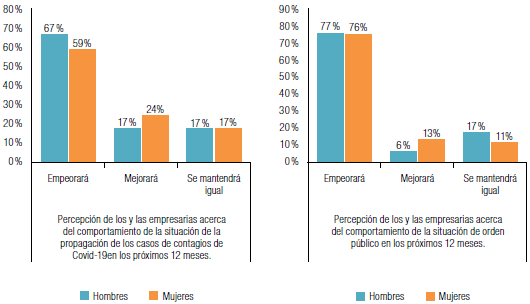 Por otra parte, la pandemia y las medidas implementadas para mitigar su expansión, han causado que varias empresas del departamento del Cauca cambien de actividad económica, pocos emprendimientos dirigidos por mujeres están operando a plena capacidad, mientras que la mayoría se encuentran operando con restricciones, cerradas o en proceso de cierre. Las empresarias han sido más optimistas en cuanto a la situación futura relacionada con el sector al que pertenecen y en cuanto al precio de materias primas y mercancías, pero ambos sexos tienen la percepción de que a futuro en temas de contagio y de orden público la situación empeorará. Se considera que las expectativas frente al desempleo son pesimistas, lo que de alguna forma afecta la contratación de personal en periodos siguientes