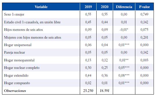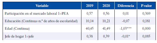 Se observa que en 2019 y 2020 aproximadamente el 57 % de la población en Popayán participó en el mercado laboral, se tenía en promedio 10 años de educación, 41 años de edad, el 55 % del total de la muestra eran mujeres, el 45 % estaban casados o en unión libre, el 9 % tenía hijos menores de 6 años y aproximadamente el 5 % de mujeres tenían hijos menores de 6 años. En cuanto a la composición de hogares se muestra que en promedio para 2019 y 2020 el 5 % eran hogares unipersonales y parejas nucleares, el 12 % monoparentales (un adulto con al menos un menor), el 27 % nuclear completo (esposo, esposa e hijos), el 40 % eran hogares extendidos (hogar nuclear sin hijos más otros parientes) y el 2 % de hogares compuestos (hogar nuclear o ampliado y al menos un integrante sin parentesco). Se observan diferencias estadísticamente significativas entre 2019 y 2020 para los años de educación, jefe de hogar, hijos menores de 6 años y algunas tipologías de hogar. Esto justifica en parte la comparabilidad de las dos muestras en el desarrollo de la estimación.