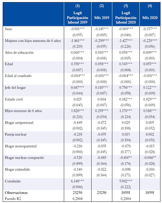 Las mujeres con hijos menores de 6 años tienen una probabilidad menor, en promedio del 30 %, en participación laboral para el año 2019, esto respecto a los hombres sin niños menores, esto indica que el cuidado de niños está relegado a las mujeres impidiendo su participación laboral. Sin embargo, para el año 2020 esta brecha se reduce al 23 %. Estos resultados no necesariamente indican una mejora en la brecha de participación laboral que beneficie a las mujeres, en el contexto de la pandemia puede estar representando la necesidad de que un miembro de la familia (en este caso la mujer) ingrese al mercado laboral con miras a aportar en el ingreso familiar, también puede explicarse por la necesidad de manutención de niños pequeños en medio de la crisis sanitaria que incentivo a las mujeres a ser partícipes del mercado laboral.