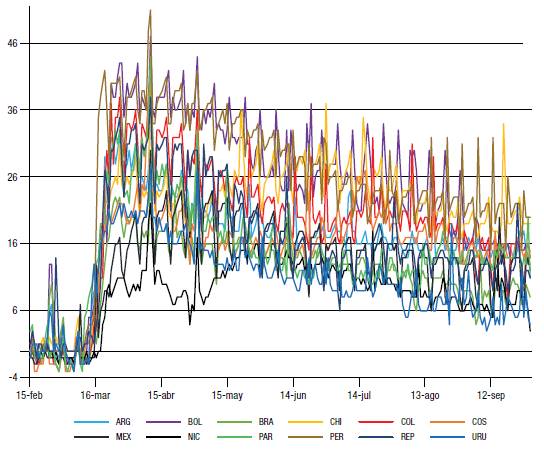 La figura 1 muestra cómo cambió el tiempo de permanencia en el hogar respecto a los días de referencia antes de la pandemia. Para el periodo analizado, en promedio las personas de los doce países aumentaron su permanencia en el hogar con relación a los días “normales”, en un 16,37 %. Perú, uno de los países con cuarentenas más prolongadas, llegó a aumentar sus niveles de permanencia en el hogar hasta en un 51 %. Llama la atención que Argentina, después de implementar cuarentenas largas y estrictas, no registró niveles de permanencia en casa tan altos como Bolivia, Colombia o Chile. En cambio, los bajos incrementos de los niveles de permanencia en hogares de Brasil, México y Nicaragua parecen estar explicados por la laxitud de sus gobiernos en materia de medidas preventivas.