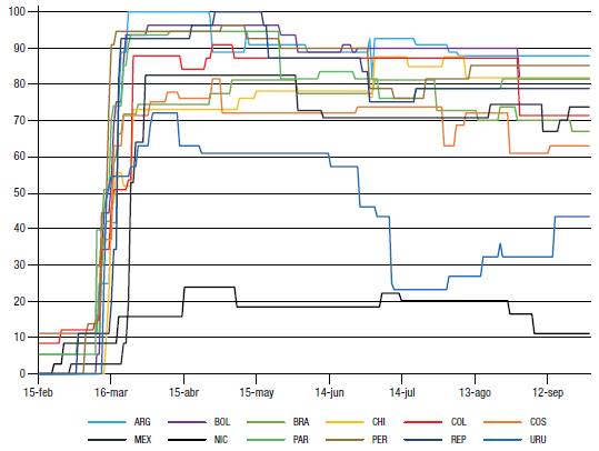 En la figura 2 se aprecian los cambios en el nivel de rigor de las políticas que buscaban inducir cambios en el comportamiento de las personas. El nivel promedio de rigor en la región durante los primeros meses de la pandemia fue de 65/100. Mientras algunos gobiernos fueron más rigurosos decretando medidas (Argentina, Bolivia y Perú), otros fueron mucho más flexibles (México, Uruguay y Nicaragua).