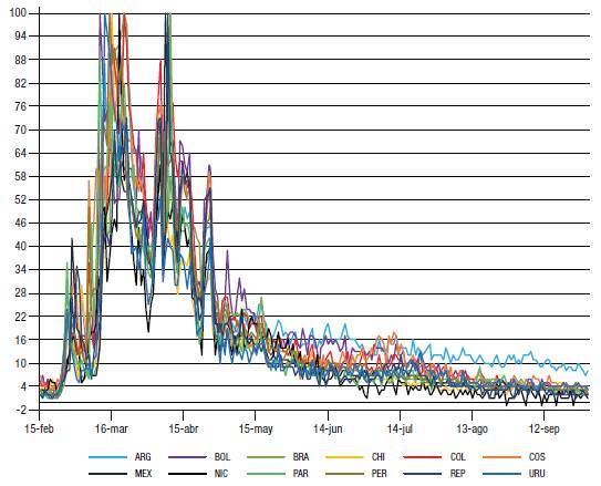 Las búsquedas para el término “coronavirus”, vistas aquí como los niveles de interés de los ciudadanos con respecto a todo lo relacionado con el nuevo coronavirus, se pueden observar en la figura 3. En los países de la región, las tendencias de búsqueda sobre la enfermedad fueron similares en el periodo analizado, con un promedio global del 17,95 %.