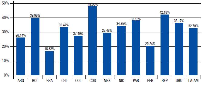 Con respecto a los niveles de confianza, la figura 4 deja ver que los países cuyos ciudadanos manifestaron menos confianza en sus gobiernos fueron Brasil y Perú, mientras que, en Costa Rica, República Dominicana y Bolivia presentó los mayores niveles de confianza de la región.