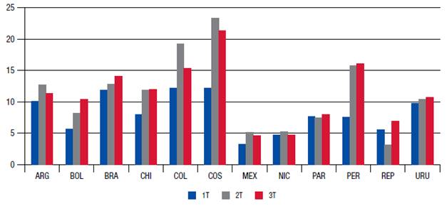 Las tasas de desempleo en la mayoría de los países de la región se hicieron mayores entre el segundo y tercer trimestre del 2020, con una media regional del 10,97 % en el periodo de análisis. La figura 5 muestra que en Colombia y Costa Rica el desempleo llegó a niveles del 19,8 % y 24 %, respectivamente. En México y Nicaragua, dos de los países con medidas más relajadas, los niveles de desempleo se mantuvieron relativamente bajos.