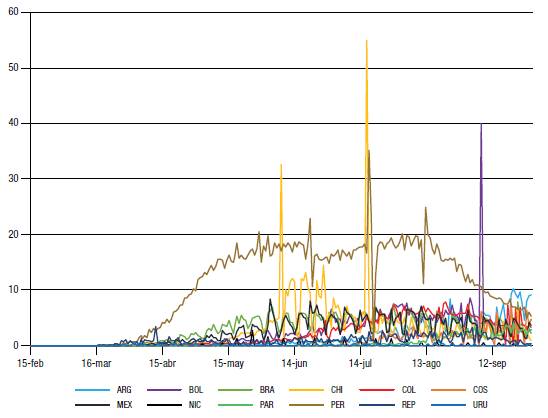 En lo que respecta a las muertes diarias por millón de habitantes a causa de la covid-19, en el tiempo de análisis, el promedio en la región fue de 2,3. En la figura 6 se aprecia como Perú fue el país con mayor promedio de muertes por millón de habitantes (10,7 muertes por millón de habitantes en promedio), mientras que países como Uruguay y Nicaragua reportaron una tasa menor.