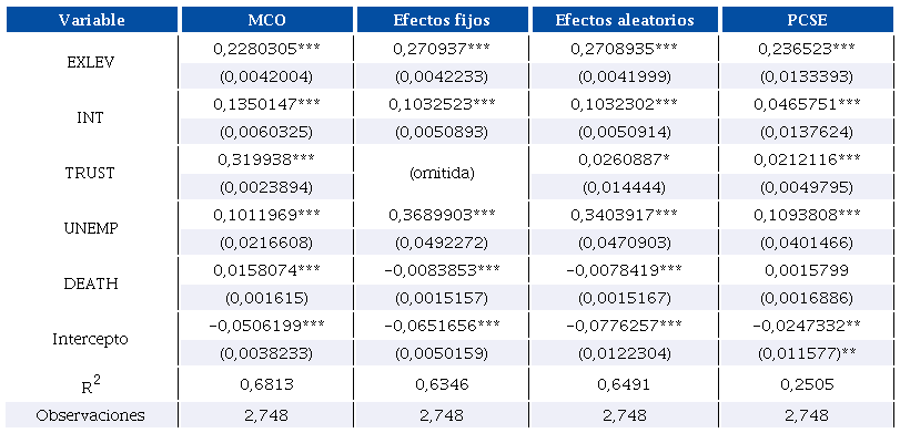 En la estimación por efectos fijos, al igual que en el modelo de datos agrupados, todas las variables son estadísticamente significativas. Sin embargo, se omitió la variable TRUST, por su nula variación en el periodo. La prueba F permitió rechazar la hipótesis nula de que los efectos inobservables de cada país son estadísticamente distintos, por lo que se optó por el modelo de efectos fijos.