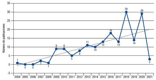 En la figura 1 se muestra la producción de documentos científicos a nivel mundial relacionados con el tema RSE y Latinoamérica, publicados en el periodo 2004-2021, como resultado de la búsqueda en la base de datos WoS. Se puede evidenciar la existencia de un interés por parte de la comunidad científica en este campo del conocimiento, lo que se refleja en una tasa de crecimiento anual del 19,24 % en la producción científica, principalmente en los últimos cinco años, periodo que representa un 50 % del total de publicaciones. Por último, se observa que para el año en curso (2021) se han realizado tres investigaciones que abarcan el tema de estudio en cuestión, lo que deja entrever la necesidad de realizar contribuciones actualizadas.