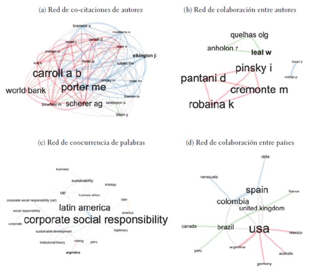 En la figura 2 se muestran los resultados obtenidos a partir de la aplicación de la herramienta Bibliometrix, en la que se incluyen (a) red de cocitación entre autores; (b) red de colaboración entre autores; (c) red de coocurrencia de palabras; r (d) red de colaboración entre países. A partir de la red de co-citaciones entre autores (figura 2a), se identificaron los investigadores más importantes de la red en función del número de citas. De igual forma, se consideró un criterio para determinar el autor más influyente entre autores específicos (Small, 1973). Se destacaron cinco autores: Archie B. Carroll, Michael Porter, Andreas Georg Scherer, World Bank y Elkington J; esto indica que la producción científica sobre RSE en Latinoamérica aún se centra en los autores seminales, lo que significa que no hay investigadores emergentes en el contexto local, y los existentes tienen como referentes a los autores mencionados. Por su parte, la red de coautorías (figura 2b) nos indicó que, en relación con el trabajo colaborativo, los autores destacados (Daniela Pantani, Ilana Pinsky, Mariana Cremonte y Alfonso Robaina) no son representativos o conocidos en el área, lo que expone una falencia en términos de colaboración entre autores.