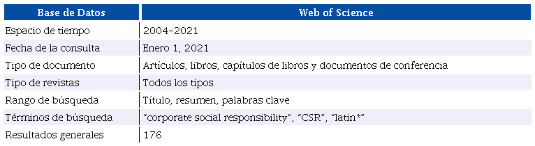 De acuerdo con las limitaciones y recomendaciones presentadas en las revisiones mencionadas (Joutsenvirta y Vaara, 2015; Niño Benavides y Cortés Cortés, 2018; Jaén et al., 2018), se realizó una búsqueda de documentos en WoS a partir de los parámetros definidos en la tabla 1.