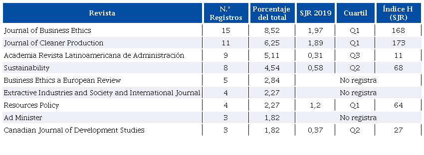 A continuación, se presenta cómo se dividen las publicaciones entre las diferentes revistas y se indica el número de registros obtenidos en WoS (tabla 2). Se hizo indispensable considerar algunas variables, como el indicador SJR (Scimago Journal Ranking), que se utiliza para medir la influencia científica del artículo promedio en la revista; el cuartil para clasificarlos según el JCR (Journal Citation Report); y el índice H-index registrado en SJR.