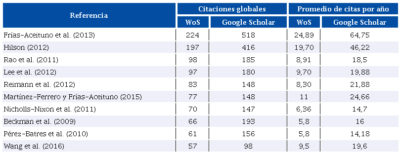 En la tabla 3 se hace referencia a las 10 investigaciones con mayor número de citas, de acuerdo con la metodología más común para determinar la relevancia de un artículo: el número de veces que ha sido citado (Ding y Cronin, 2011). Para este campo de investigación se muestra la cantidad de veces que se citan documentos en WoS y Google Scholar; y el promedio anual de citas de estas bases de datos desde la fecha de publicación hasta 2019.