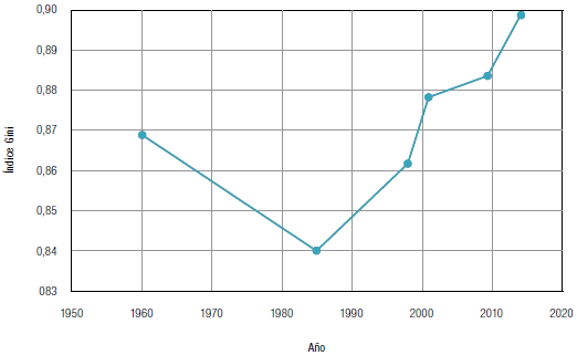 Al observar las cifras sobre la realidad del campo colombiano, una de las más escandalosas es la desigualdad existente en la distribución de tierras en el país. Si se observa el Coeficiente Gini (figura 1) para la propiedad rural en Colombia, se nota que este es de 0,89 (Instituto Geográfico Agustín Codazzi [IGAC], 2012). Esto quiere decir que casi el 90 % de la tierra rural está concentrada en pocas manos, que ostentan un poder significativo en la economía política del país (Faguet, et al., 2020). Estas cifras se constatan con el Censo Nacional Agropecuario de 2014 y el comportamiento de las Unidades Productoras Agropecuarias (UPA).