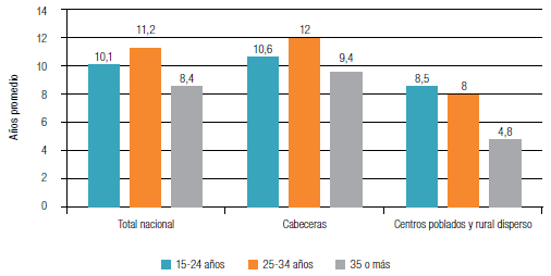 El número de años dedicados a la educación se suma a las brechas existentes en el mundo rural, puesto que el número de años promedio de educación es muy inferior para los pobladores rurales, comparado con las cifras de las cabeceras municipales y con el total nacional (figura 2). En las personas de 35 años o más, estas brechas están más acentuadas; la diferencia con sus pares en las cabeceras corresponde a 4,6 años. Lo anterior afecta el acceso a oportunidades en empleos con mayores niveles de capital humano, incidiendo así en las decisiones de migración de esta población (Penagos, et al., 2020). Esta brecha educativa se refleja en el tipo de empleo rural que se observa, puesto que los bajos niveles de educación están asociados con actividades de baja productividad y, al mismo tiempo, la baja productividad y los bajos ingresos laborales tienen una relación directa (Leibovich, et al., 2006).