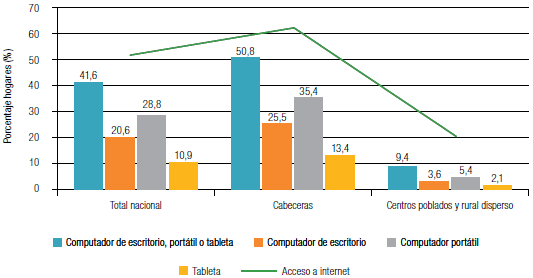 Por otro lado, al rezago escolar evidente en las zonas rurales se suma el acceso desigual a la conectividad digital. A saber, solamente el 21 % de los hogares en centros poblados y rural disperso tienen acceso a internet, frente al 62 % de sus pares urbanos (figura 3). De la misma forma, la desigualdad frente a la proporción de hogares que poseen computador de escritorio, portátil o tableta es desmesurada. Mientras cerca del 51% de los hogares poseen ya sea computador de escritorio, portátil o de escritorio en las cabeceras municipales, solamente el 9,4 % posee uno en los centros poblados y en rural disperso. Asimismo, aunque hasta el momento no es posible determinar con certeza el impacto que tendrá la crisis en la implementación curricular en los distintos grados de la enseñanza, se prevé una profundización de las diferencias en lo referente a los logros de aprendizaje, debido a las desigualdades educativas imperantes, y a un acceso desigual a la cobertura curricular (Cepal y Unesco, 2020).