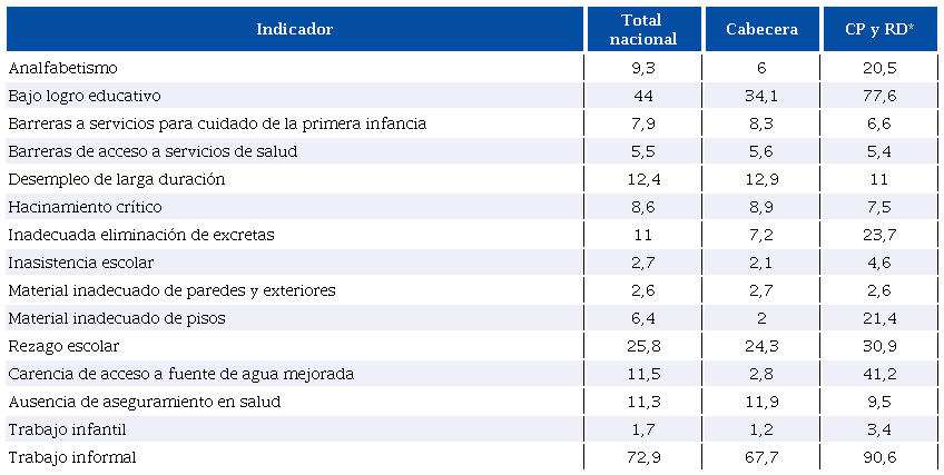 Por otro lado, se obtienen mayores perspectivas cuando se observa el Índice de Pobreza Multidimensional [IPM]. En el 2019, la pobreza multidimensional en las cabeceras del país fue del 12,3 %, mientras que en los centros poblados y en rural disperso ascendió a 34,5 %. Esto significa que el porcentaje de personas en situación de pobreza multidimensional en centros poblados y en rural disperso fue 2,8 veces el de las cabeceras. En la tabla 1 se observan los 15 indicadores que componen el IPM para el 2019. Los hogares con analfabetismo en centros poblados y rural disperso corresponden al 20,5 %. Lo anterior significan que estos territorios presentan 3,4 veces más analfabetismo a comparación de las cabeceras. De la misma forma, el bajo logro educativo corresponde al 77,6 % en la ruralidad, comparado con el 34,1 % de las cabeceras, junto con la inasistencia escolar, que es el doble de la de las cabeceras. Esto significa que las brechas que hay entre la educación urbana y rural son gigantescas. En tanto, el indicador con mayor diferencia entre los hogares rurales y urbanos es la deficiencia de acceso a fuentes de agua mejorada, que para el caso rural es de 41,2 %, con lo que se obtiene que este es un índice casi 15 veces mayor al urbano.