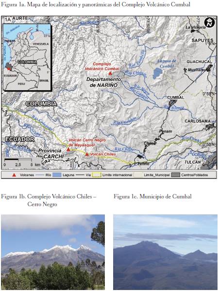 El Complejo Volcánico Cumbal (ver Figura 1b), está compuesto por cuatro edificios de estadios volcánicos superpuestos uno encima del otro, con dos volcanes considerados activos actualmente: Mundo Nuevo y Cumbal. De acuerdo con los estudios, en caso de una posible erupción, se pueden presentar flujos de lava, corrientes de densidad piroclástica, proyectiles balísticos y avalanchas de escombros (Méndez et al., 2014). El Complejo Volcánico Chiles - Cerro Negro (ver Figura 1c), se encuentra en la línea fronteriza Colombo - ecuatoriana, de acuerdo con Cortés y Calvache (1997), la actividad predominante son los flujos de lava, corrientes de densidad piroclástica y avalancha de escombros asociadas a los colapsos de flanco.
